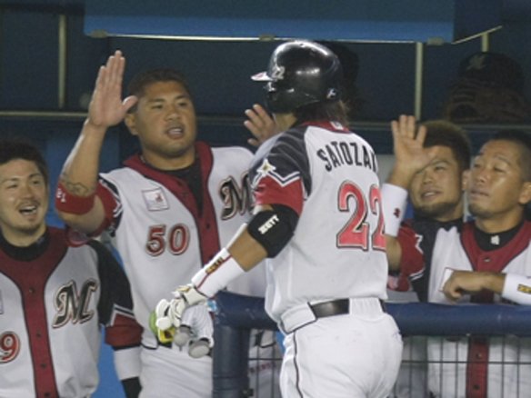 五輪から合流後初ホームランを放ちベンチに迎えられる里崎