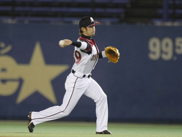 4番 ズレータ 遊ゴ 1-3から叩きつけた二遊間への当たり。ショート・金子誠に回り込まれ、押えられてしまったが、進塁打となり、2塁ランナー・オーティズは3塁へ! |