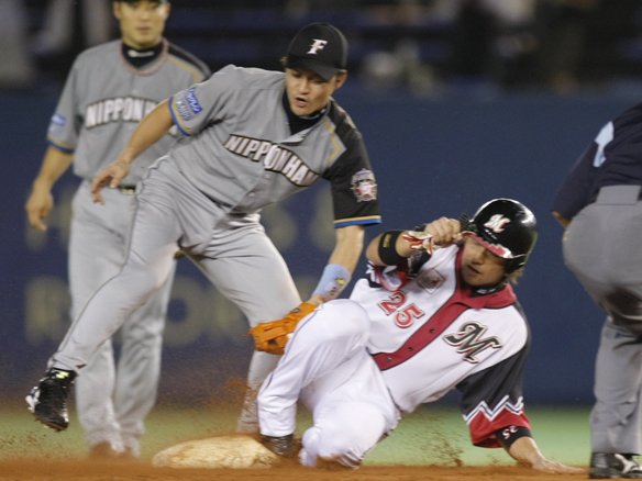 投手 清水 4番 稲葉 一ゴ 2-2から引っ張られたが、弱い当たりがファースト・福浦の正面へ!福浦がそのまま1塁へ。 しかし進塁打となり、ランナー、ぞれぞれ進塁。 |