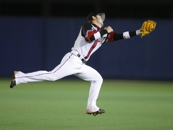 投手 清水 7番 金子誠 二飛 1-0から打ち上げさせた打球はセカンド・田中雅とライト・サブローの間へ。しかし田中雅が全速力で下がり、グラブの先で間一髪で捕球! |