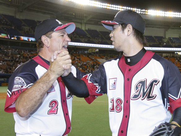 今季2度目の完封勝利を納めバレンタイン監督とがっちり握手する清水直