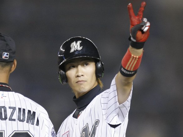 投手 涌井 1番 西岡 二安 2-2からの5球目、アウトコース寄りに高く外れるストレートを叩きつけ、大きく弾んだ打球はセカンド・片岡の前に飛び、送球よりも1歩速く1塁を駆け抜けた! |