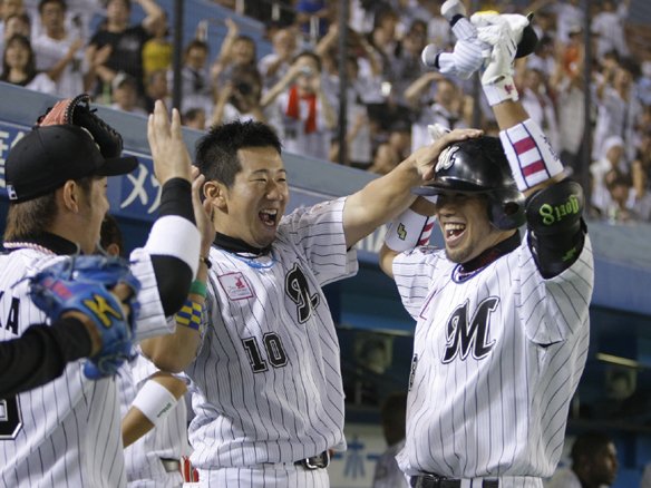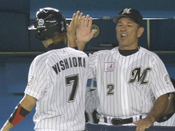 今江のスクイズで生還しバレンタイン監督に迎えられる西岡