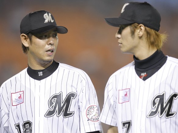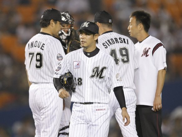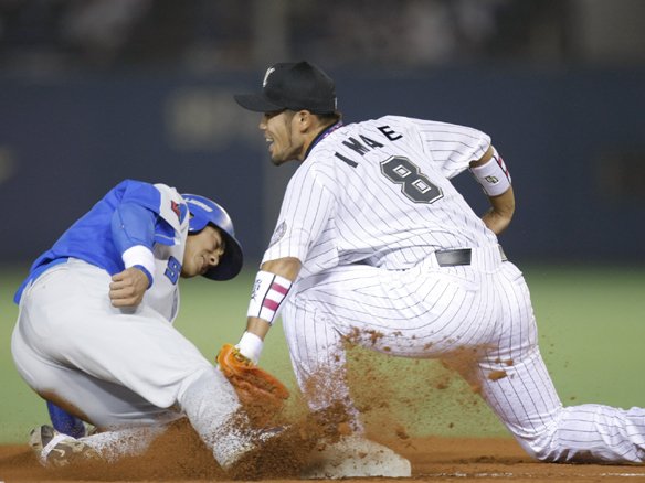 投手 荻野 (埼玉西武 2塁ランナー・大島→赤田) 2アウトを取ったところで、キャッチャー・里崎とショート・西岡がマウンドの荻野に歩み寄り、声をかけます。 |
