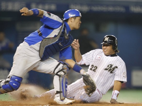 ショートゴロの間に3塁走者・里崎がホームに突っ込むも、判定は惜しくもアウト…