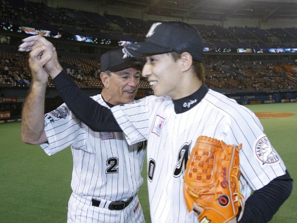 試合を締めた荻野を迎えるバレンタイン監督