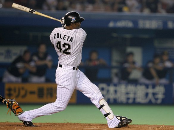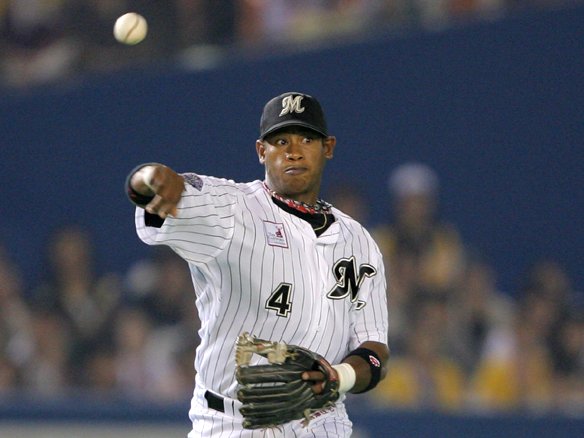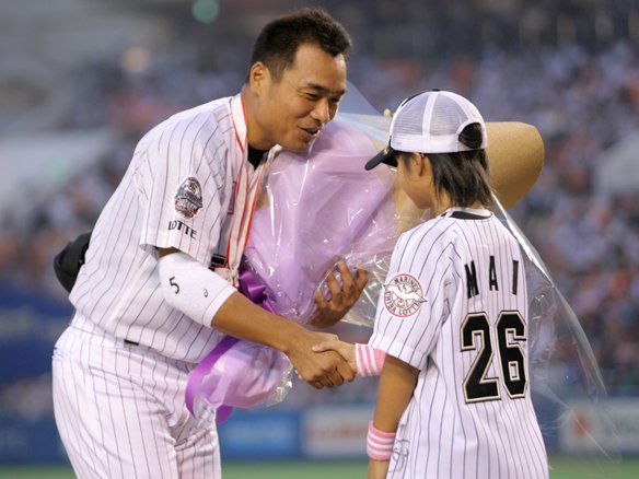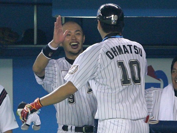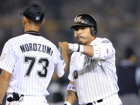 6番 サブロー 左本 0-1から真ん中高めの甘いカーブを見逃さずに打ち返した打球はレフトスタンドへ。フェンス際に飛び込む5号ソロホームラン!!マリーンズ勝ち越し!5対4。 ![]() 6