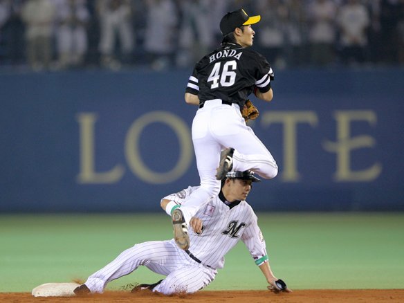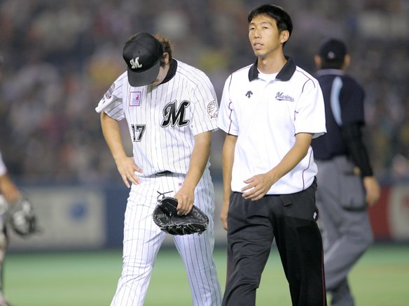 投手 伊藤 6番 松田 中安 0-1からの2球目の投球時にピッチャー・成瀬が左足を痛めたような仕草を見せたのに対し、バレンタイン監督がマウンドへ。投球練習を2球したが、ここでピッチャー交代。 成瀬は5回0/3、89球、7安打、2失点でランナーを3人残して降板。 ![]() 5