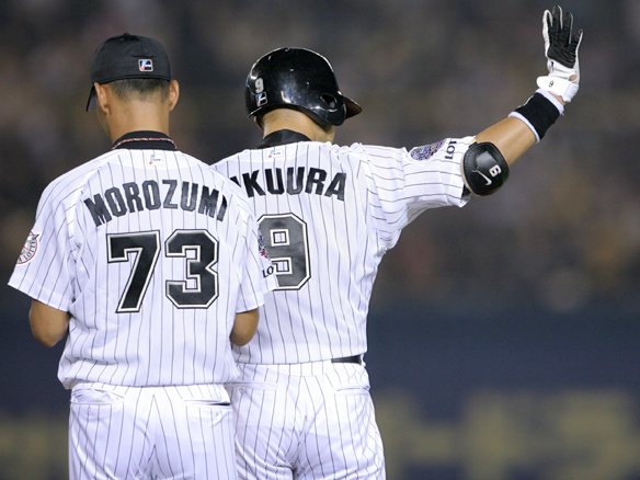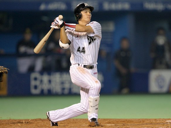 4番 松中 左安 2-2からアウトコース高めのストレートを弾き返され、打球はセカンドベース寄りに守っていた西岡の横を抜けた。 |