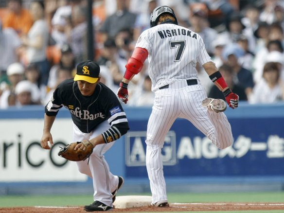 西岡が緩いサードゴロで俊足を飛ばすが後一歩及ばず