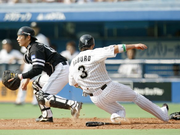 5番 サブロー 左越二 1-1からの3球目、インコース寄りのストレートを弾き返した打球は、レフト・大村の頭上を越え、ダイレクトでフェンスに当たった! 2塁ランナー・ズレータがホームイン!6対3。 打ったサブローは2塁に滑り込む!! ![]() 6