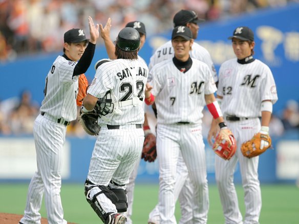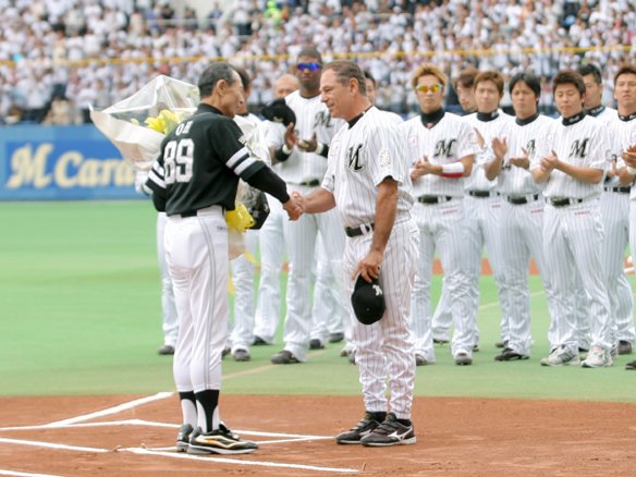 西岡、早川、里崎の3連打で待望の追加点を奪い、リードを4点に広げました! 6回2/3で1,000投球回を達成した和田に花束が贈られました。 |