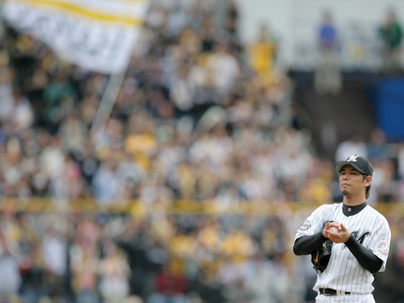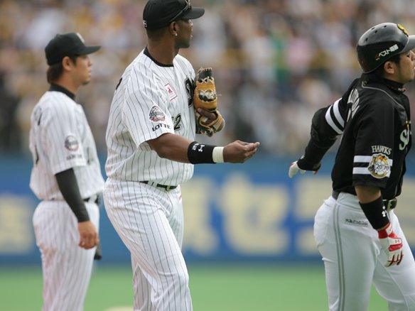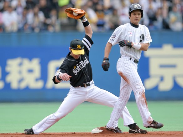 ここでバレンタイン監督が自ら2塁へ向かい、西岡の状態を確認。 そのまま西岡が2塁へ戻り試合再開。 |