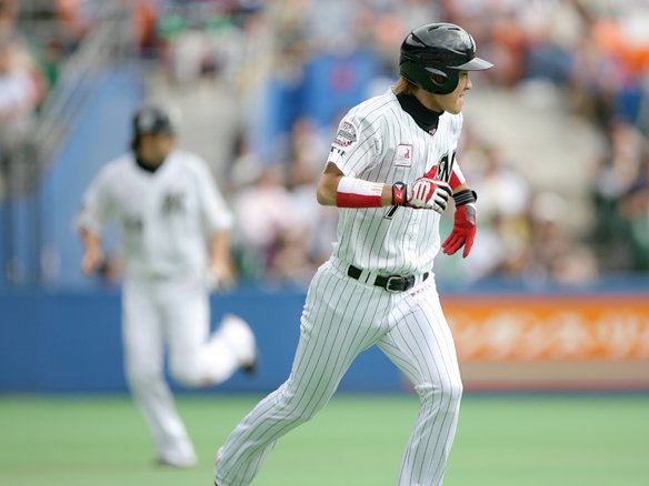 西岡が3点目のホームを踏みベンチで笑顔を見せる