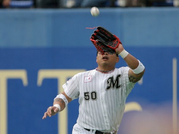 投手 和田 3番 里崎 三ゴ 1-0から引っ張った3塁線際への打球。サード・松田がダイビングキャッチし、起き上がって素早く1塁へ送球…。 |