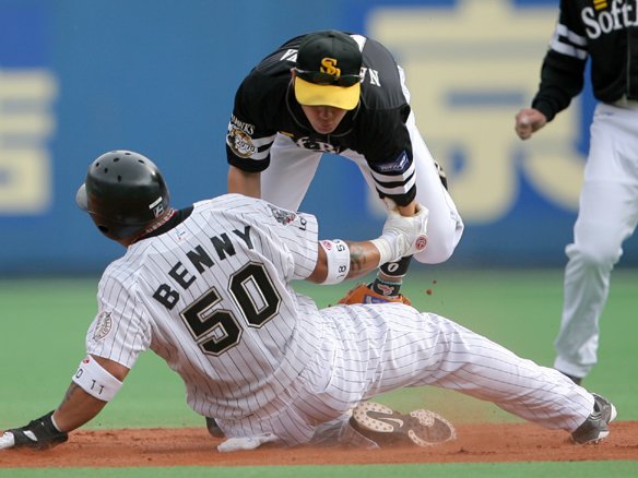投手 和田 6番 ベニー 左安 0-1から引っ張り、三遊間を破った! |