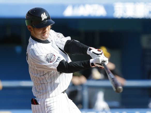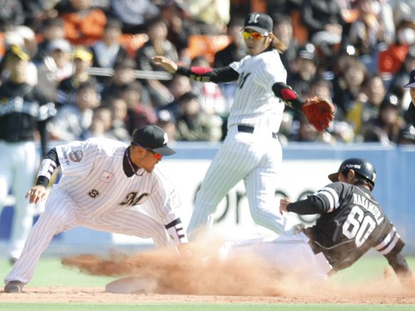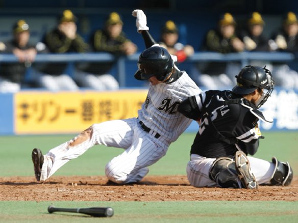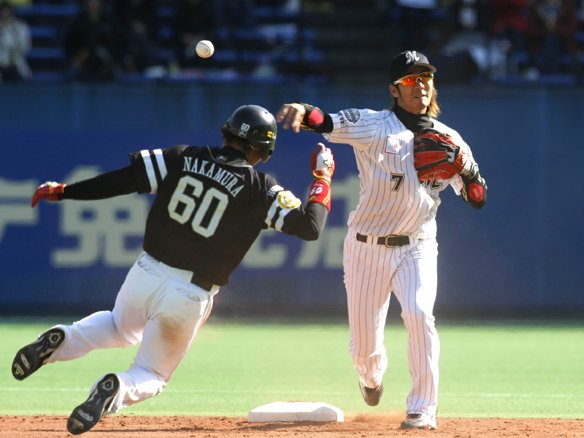 2番 柴原 捕犠 初球を1塁線に転がされ、キャッチャー・里崎が処理。 |