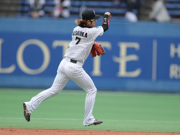 セカンドベース付近への打球をさばく西岡の好プレー