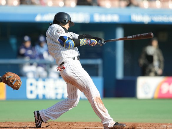 5番 堂上剛 左二 初球、アウトコースの球を逆らわずに弾き返された打球は、レフト・神戸の前へ。神戸、前進するも一歩及ばず、打球は後ろに逸れる間に1塁ランナー・平田は3塁へ、打った堂上剛も2塁へ・・・。記録は2ベースヒット。 |