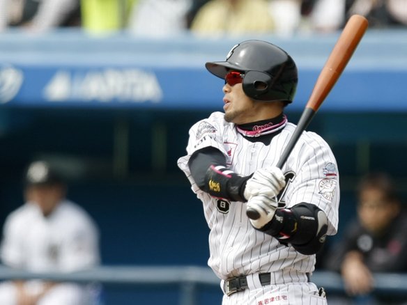 6番 G.G.佐藤 右飛 大きな打球もフェンス手前で失速。ライト・サブローが落ち着いて捕球。  |