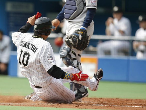 1番 早川 違反 初球からエンドランを仕掛けた!外角に外されたボールに何とかバットを当てようと、早川の手を離れたバットが2塁へ送球しようとしたキャッチャー・細川に当たってしまった・・・。 バレンタイン監督が抗議するも、早川は守備妨害と判定され、アウト。  |