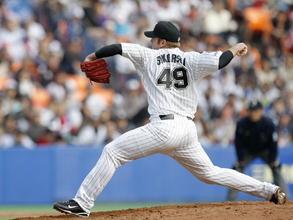 2死1,3塁と絶体絶命のピンチでマウンドに上がったシコースキー、見事にライオンズの4番・中村を打ち取って無失点で切り抜けました!  |