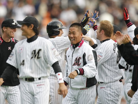 先頭・福浦が安打で出塁すると、代走・早坂が盗塁と暴投で3進。 その後2者連続の敬遠などで1死満塁となり、打席に入った満塁男・大松がしっかりと犠牲フライを放ち、今季初のサヨナラ勝ちを収めました! これでマリーンズは連勝。 昨季の王者ライオンズを迎えた開幕カードを見事に勝ち越し、素晴らしい2009年シーズンのスタートを切りました!  |