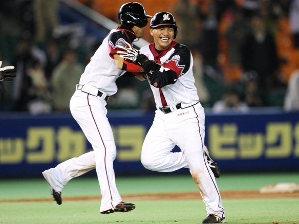 サヨナラ満塁ホームランを放ち西岡と喜ぶ井口!!