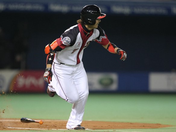 5番 サブロー 右犠飛 2-0からの3球目、インコース高めのストレートに差し込まれながらも右中間に運んだ打球は、ライト・中島に追いつかれた。 しかし、タッチアップから3塁ランナー・西岡がホームイン!!2対0。 ![]() 2