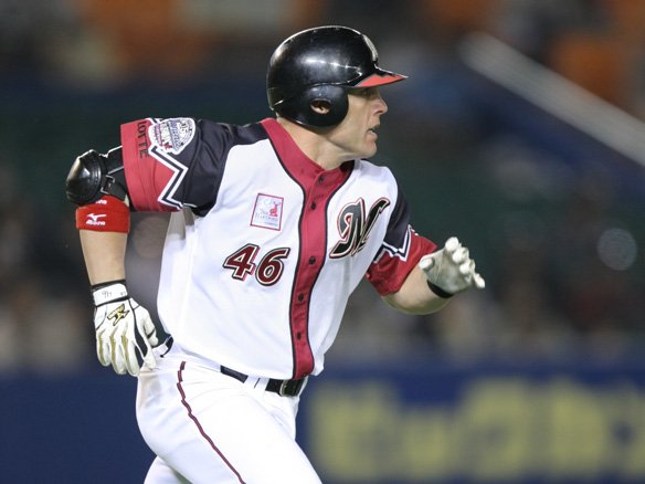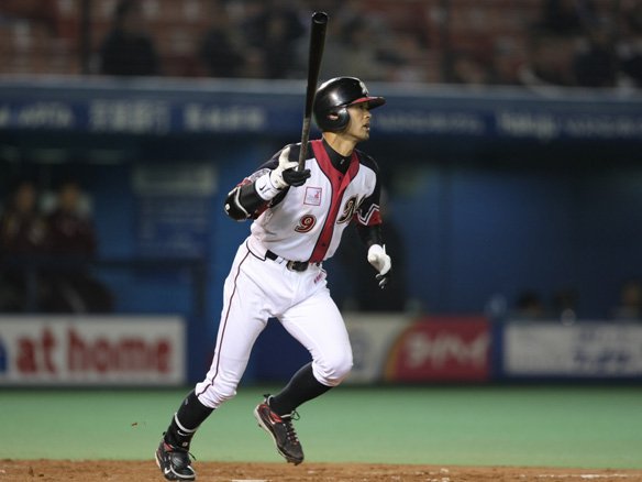 9番 今江 右安 初球、アウトコースのストレートを1塁線に弾き返した打球は、ファースト・セギノールの頭上を越え、ライト・牧田の前で弾んだ!! 1塁ランナー・バーナムJr.は一気に3塁に進んだ!!  |