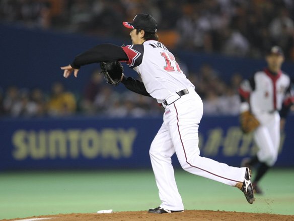 投手 成瀬 5番 中村紀 右飛 2-3からの7球目、高めのチェンジアップでタイミングを外して1塁線に打ち上げさせた打球は、ライト・サブローが前進してキャッチ!!  |