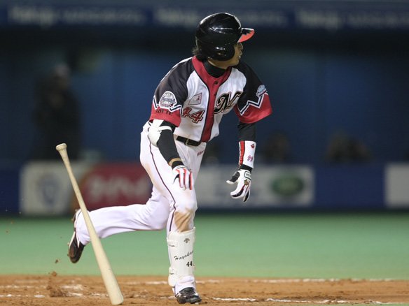 5番 サブロー 左安 初球、インコースより高めのストレートを振りぬいた打球は、レフト・内村の前で弾んだ!!  |