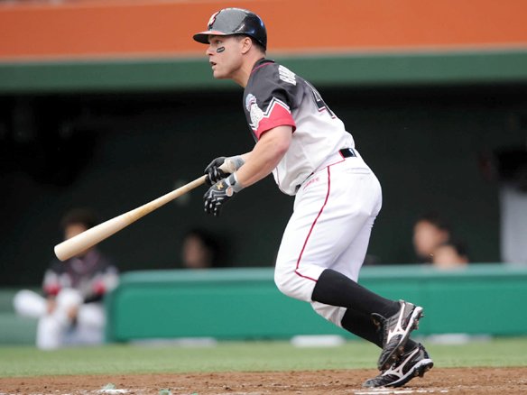 2番 バーナムJr. 右飛 初球を打ち上げてしまった・・・。ライト・G.G.佐藤がやや前進して捕球。  |