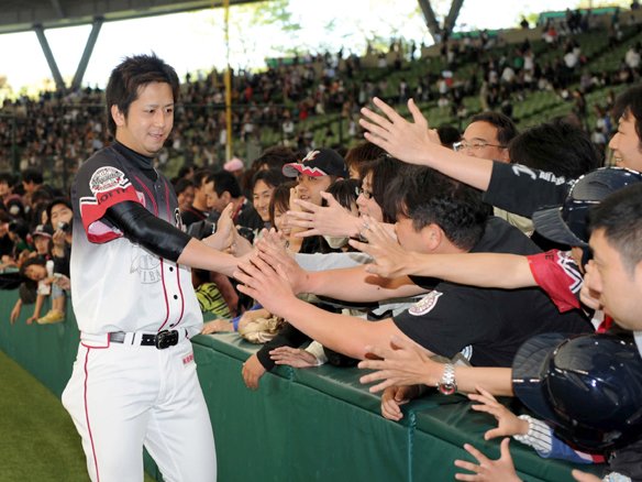 試合後、ファンとハイタッチをかわし喜びを分かち合う大嶺