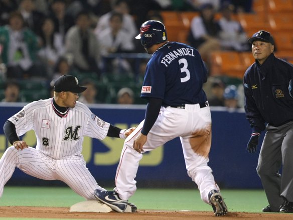 キャッチャー・里崎の好送球でフェルナンデスをタッチアウト