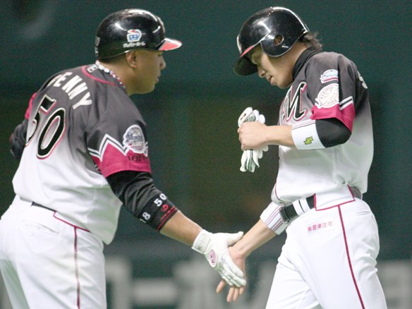 里崎、大松のヒットなどで2死1,2塁とチャンスを作りましたが、反撃もここまで。 10安打を放ちながらも2点に抑えられ、2対6で3連戦の初戦を落としてしまいました。 これでホークス戦は3連敗。最下位脱出もなりませんでしたが、明日は気持ちを切り替え、まずは1勝1敗のタイに戻したいところです!  |