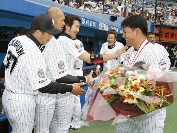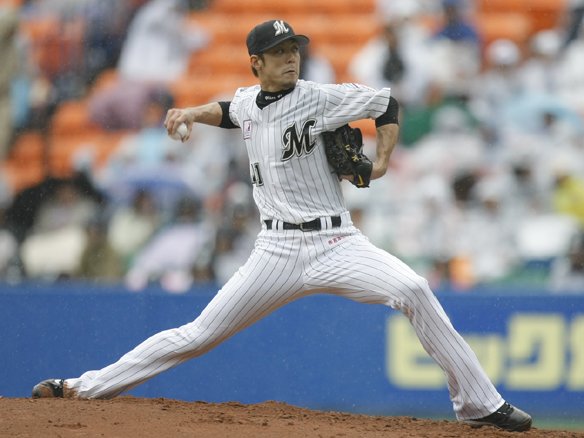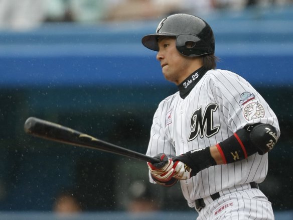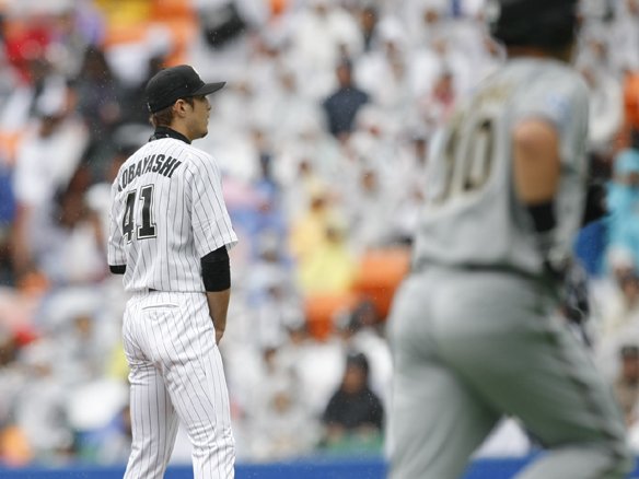 雨でぬかるんだマウンドに苦戦する八木に対し、ベニーの2ベースヒットと連続四球で2死満塁と一打同点のチャンスを作りましたが、里崎が空振り三振に倒れてしまい、得点ならず・・・。 |