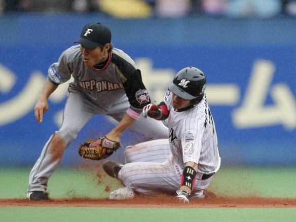 4番 井口 三ゴ 0-1から1塁ランナー・西岡がスタート。キャッチャー・鶴岡が2塁へ送球するもセーフ!盗塁成功! |