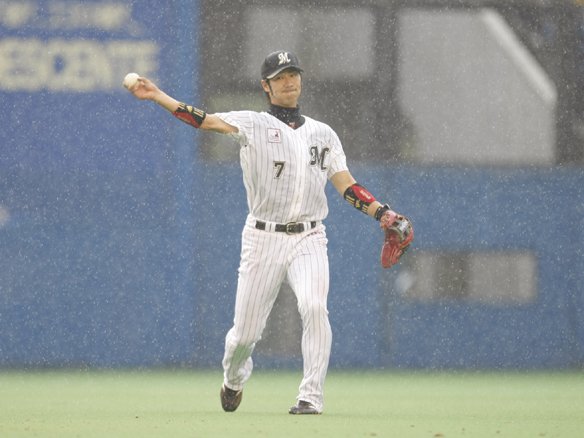 西岡、雨脚が強まる中ショートゴロを捌く