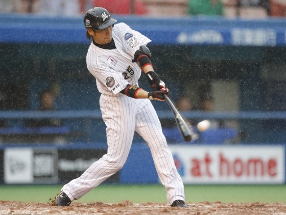 5番 里崎 左安 アウトコースの変化球を強引に引っ張った打球は、狭い三遊間をしぶとく抜けた! |