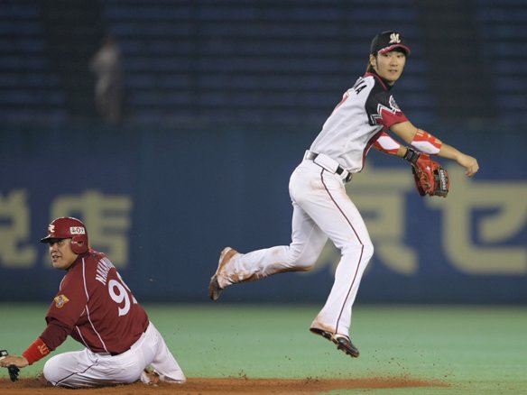 9番 内村 空三振 2-0からウエストしたボールを捕球したキャッチャー・里崎が1塁へ送球するも大きく逸れて、ライト線へ転々・・・。 1塁ランナー・嶋は2塁を回ったところでショート・西岡と接触。これが走塁妨害と判定され、嶋は3塁へ・・・・  |