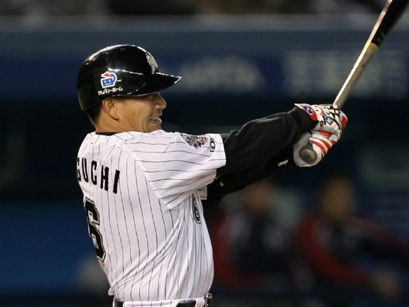 投手 涌井 4番 井口 中越二 高めの初球を振り抜いた打球は、センター・大崎の頭上を軽々と越え、センターフェンス上部に直撃!  |