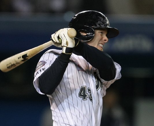 5番 ベニー 二ゴ アウトコース低めの変化球を右打ちした打球は、セカンド・片岡のほぼ正面。その間に2塁ランナー・井口は3塁へ。  |