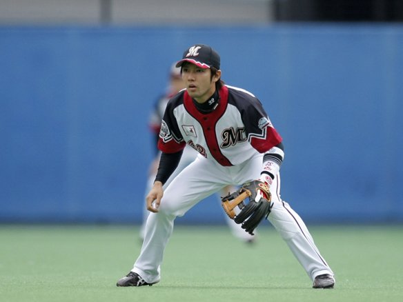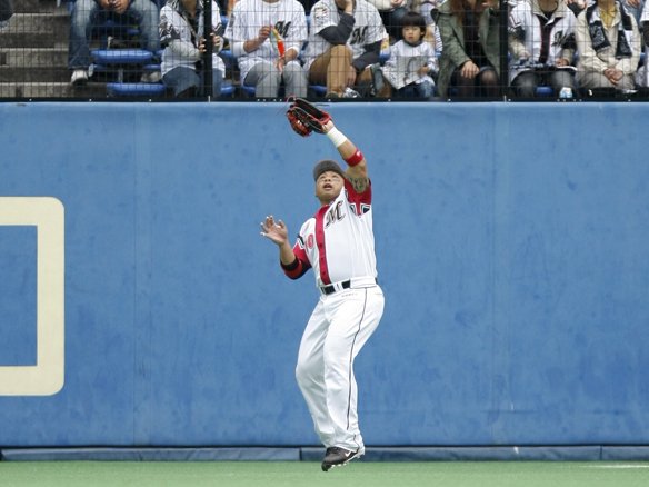 投手 荻野忠 5番 平尾 左飛 0-1から133キロのストレートを打った打球は、レフトへの大飛球。この回から守備に入った大松がバックし、最後は余裕を持ってキャッチ!  |