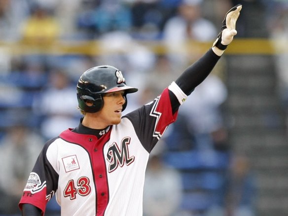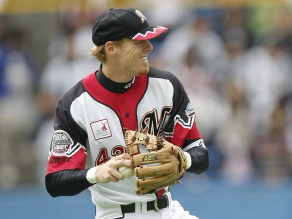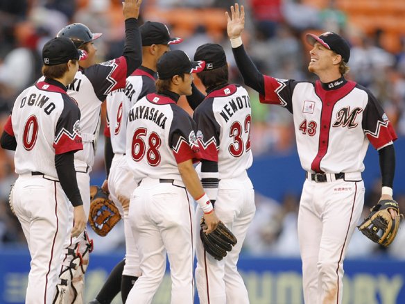 9番 ランビン 左越二 1-2からインコースへの変化球を腕をたたんでレフトへ運んだ打球は、フェンス上段にダイレクトで当たった!3塁ランナー・井口、2塁ランナー・里崎が相次いで還り、逆転!!5対4。 ![]() 5