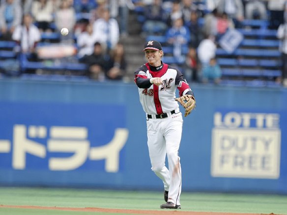 7番 佐藤 一ゴ 0-1から縦に割れる変化球を打たせてファーストへの平凡なゴロ。ファースト・福浦が待って取って、ベースカバーに入った荻野にトス!  |