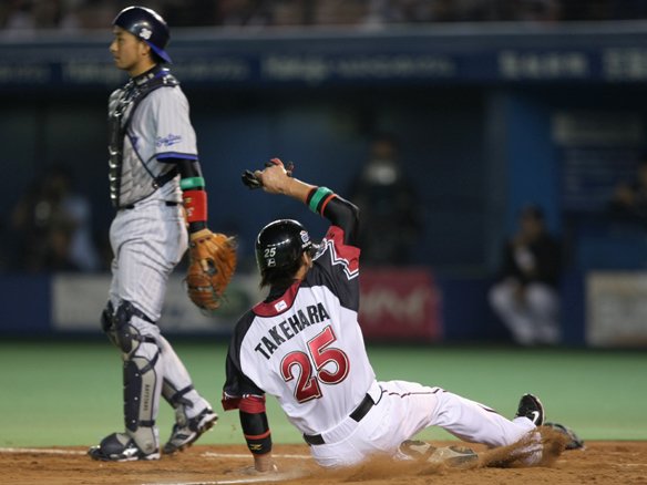 4番 井口 2-1から引っ張ってサードゴロ。内野が通常の守備位置だったこともあり、転がった瞬間に3塁ランナー・竹原がスタートしてホームを陥れた。1対1。 サード・村田は1塁へ送球し、1塁はアウト。 ![]() 2