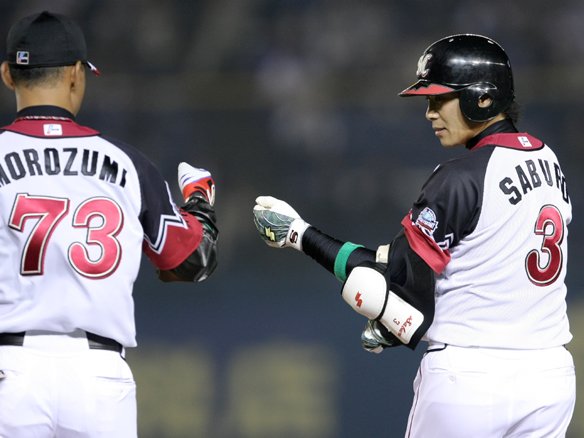 3番 サブロー 四球 1-3から内角低めの際どいボールを選んだ!  |