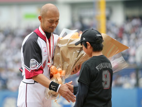 2番 福浦 左飛 フルカウントからアウトコースの球を福浦らしいバッティングでうまく流し、レフト線へ落ちようかという打球。しかしレフト・福地が快足を飛ばしてランニングキャッチ・・・。  |
