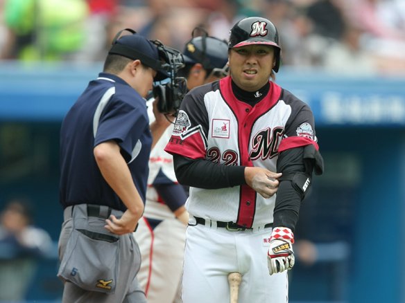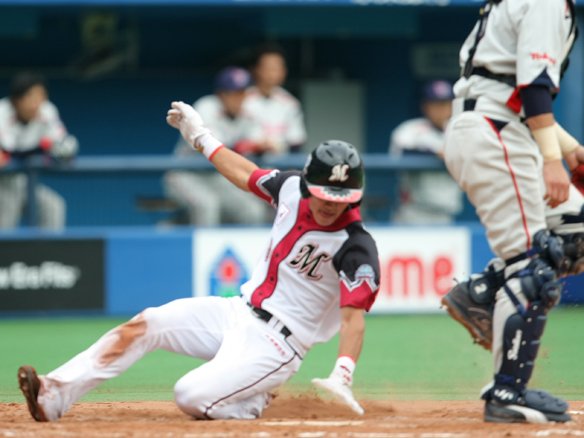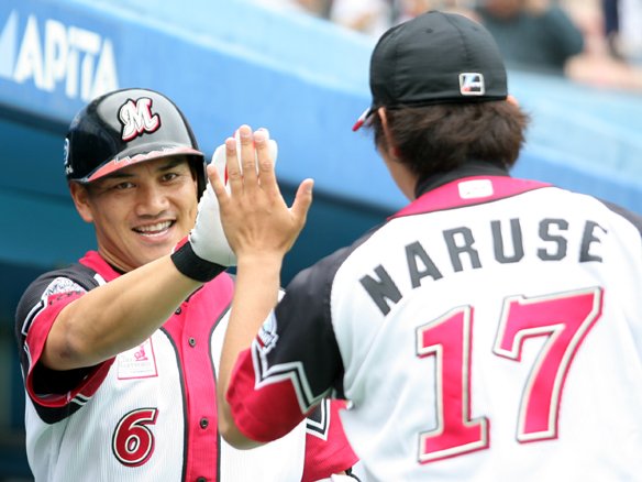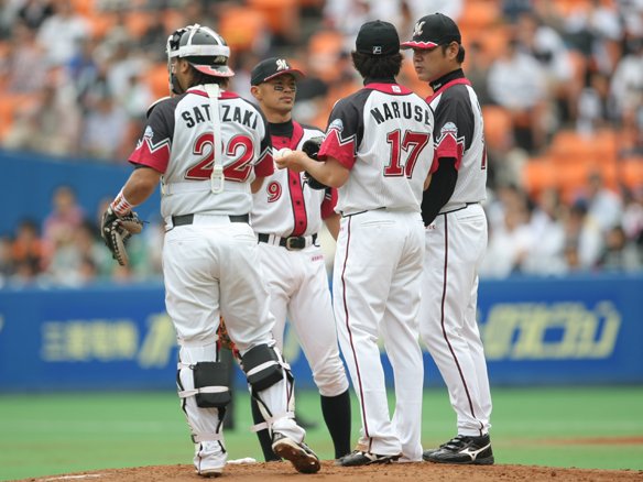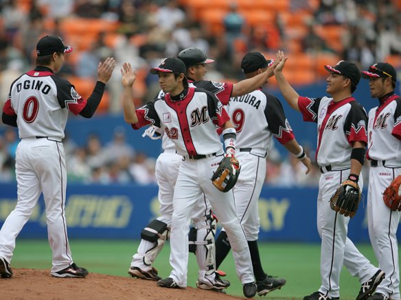先頭・大松が四球を選んで出塁するも、里崎がアンラッキーな併殺に倒れるなどして、この回は追加点を奪えず・・・。あとは、4点差を守り切るのみです!  |